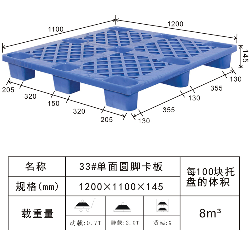 塑料托盤采用全新HDPE材料一次注塑成型,具有良好的抗壓性表面硬度高不易變形,且韌性非常好不易變形,在零下25度至零上65度的惡劣環(huán)境下使用,正常使用壽命可長達6年。