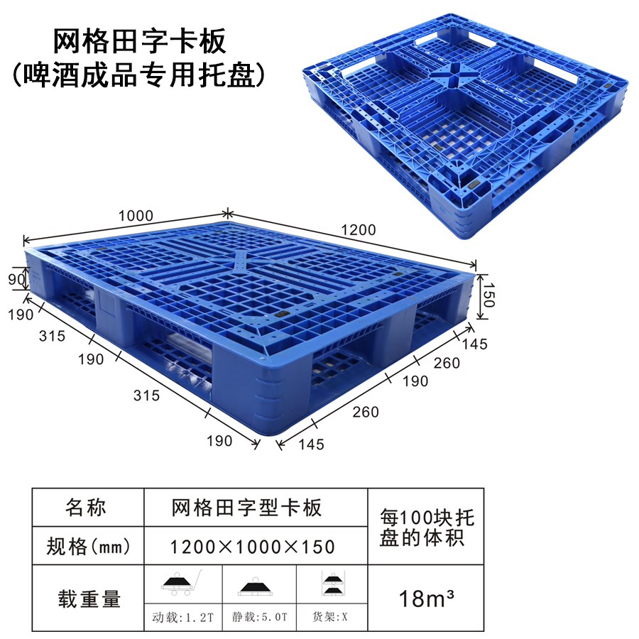 材料 | PP,PE | 型式 | 四面進叉 | 適用范圍 | 化工廠、飲料廠、啤酒廠專用托盤 | 尺寸 | 1200×1000×150 | 靜載 | 5T | 類型 | 田字 | 百個數(shù)量體積 | 18m3 | 貨架 | X |