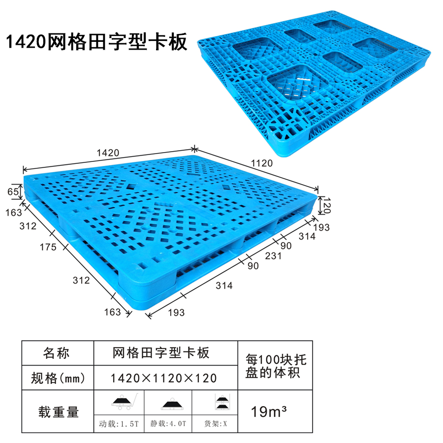 材料 | PP,PE | 型式 | 四面進(jìn)叉 | 適用范圍 | 啤酒廠專用托盤(pán) | 尺寸 | 1420×1120×120 | 靜載 | 4T | 類型 | 田字 | 百個(gè)數(shù)量體積 | 19m3 | 貨架 | X |