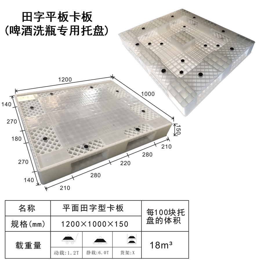 材料 | PP,PE | 型式 | 四面進(jìn)叉 | 適用范圍 | 啤酒廠專用托盤 | 尺寸 | 1200×1000×150 | 靜載 | 6T | 類型 | 田字 | 百個(gè)數(shù)量體積 | 18m3 | 貨架 | X |